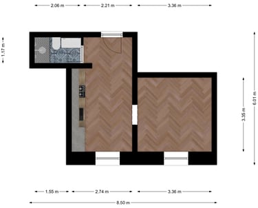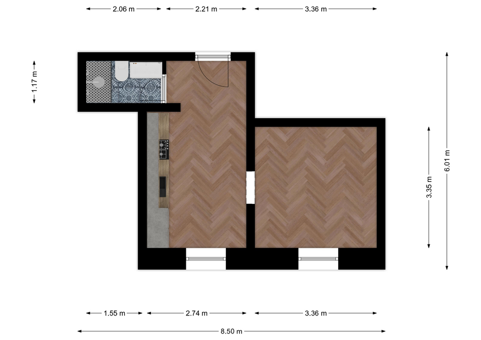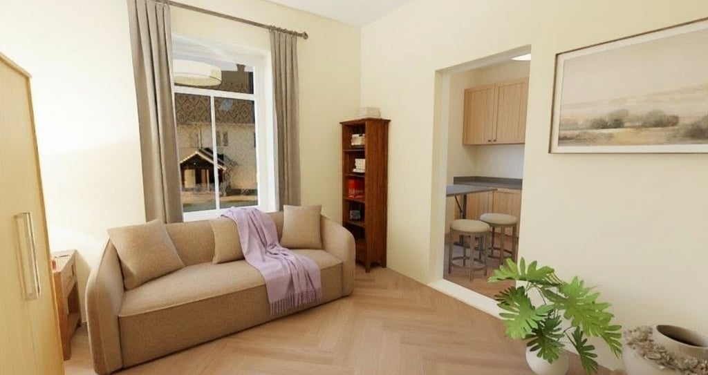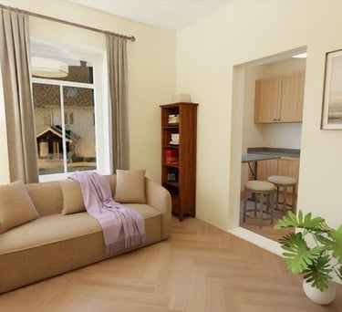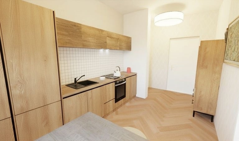 Przestronna i wygodna kawalerka. Duża przestrzeń kuchenna połączona z przedpokojem i jasny, ustawny pokój to doskonałe połączenie dla singla.